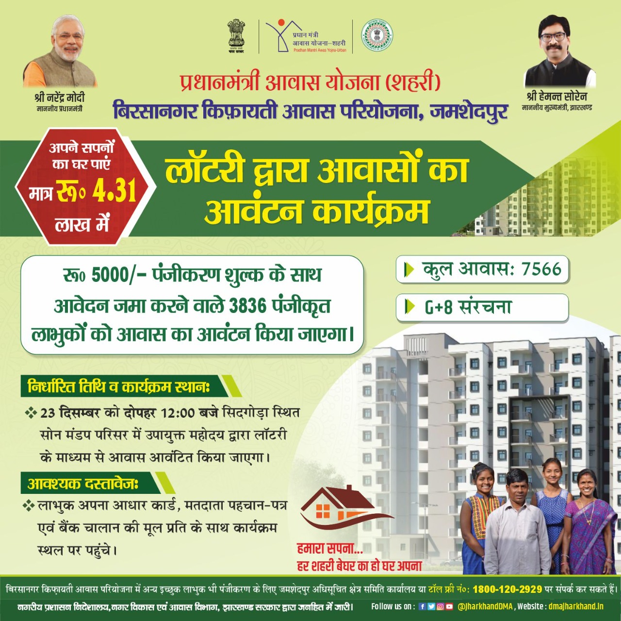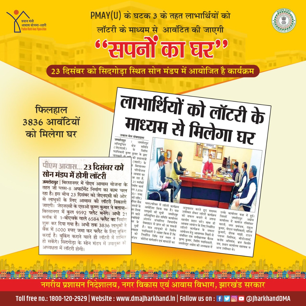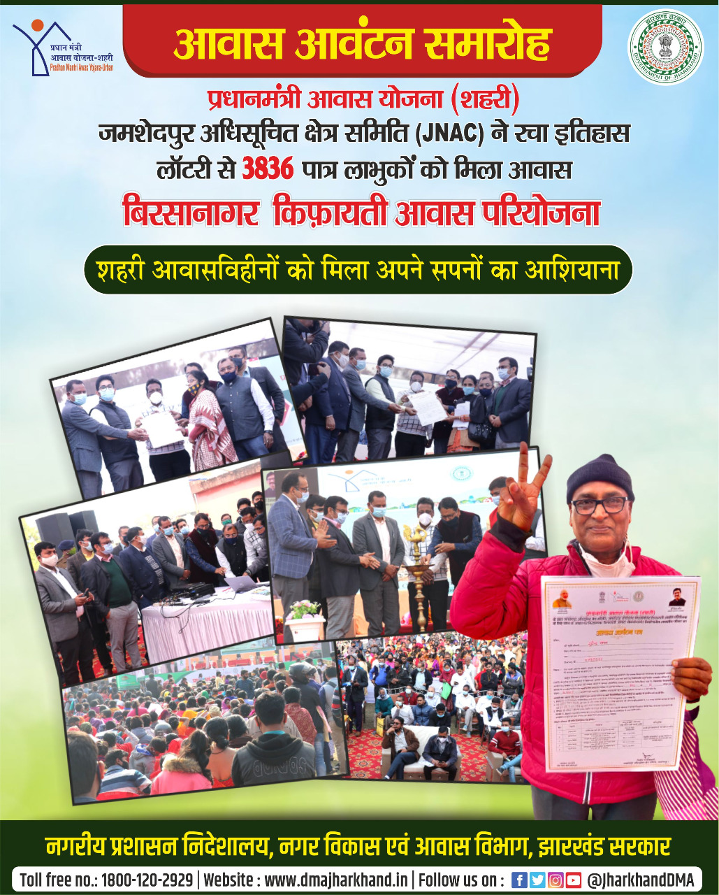 Media Coverage Promotional infographic in respect of Birsanagar Affordable Housing Project house distribution through lottery under PMAY(U) Scheme.