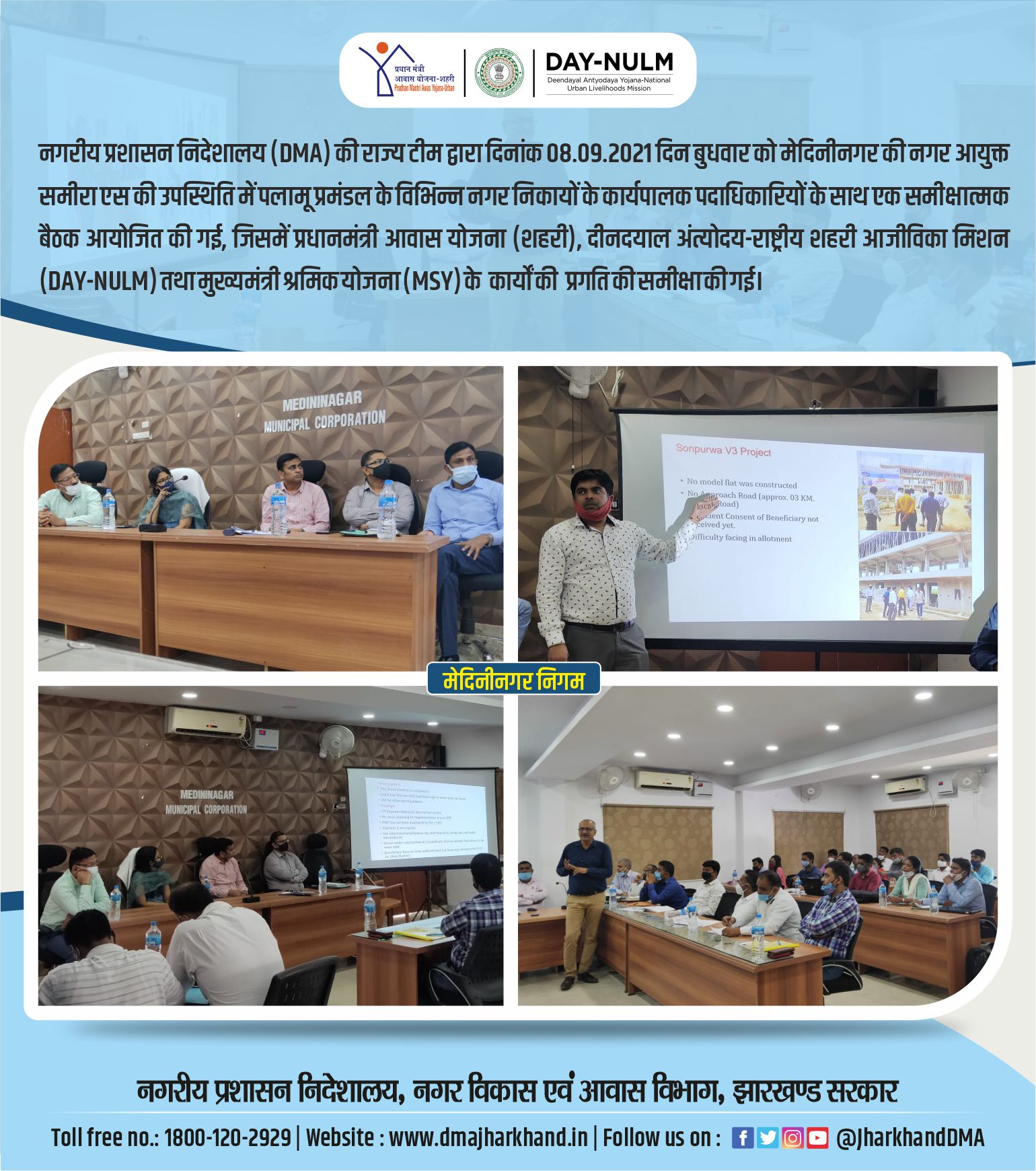 Photo collage for social media promotion of the review meeting of PMAY(U) and DAY-NULM scheme, this activity done on 08.09.2021 in Medninagar Nagar Nigam by the DMA Officials.