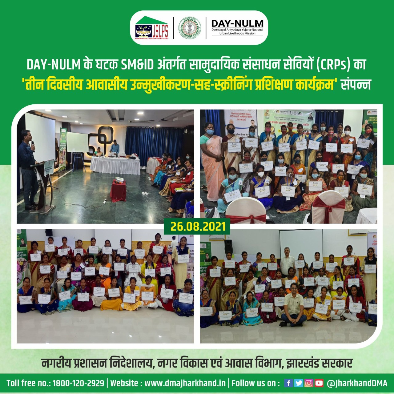 Photo collage of CRPs training closing ceremony at Hotel Royal Ranchi and Hotel Shivalik Bule on 26.08.2021.