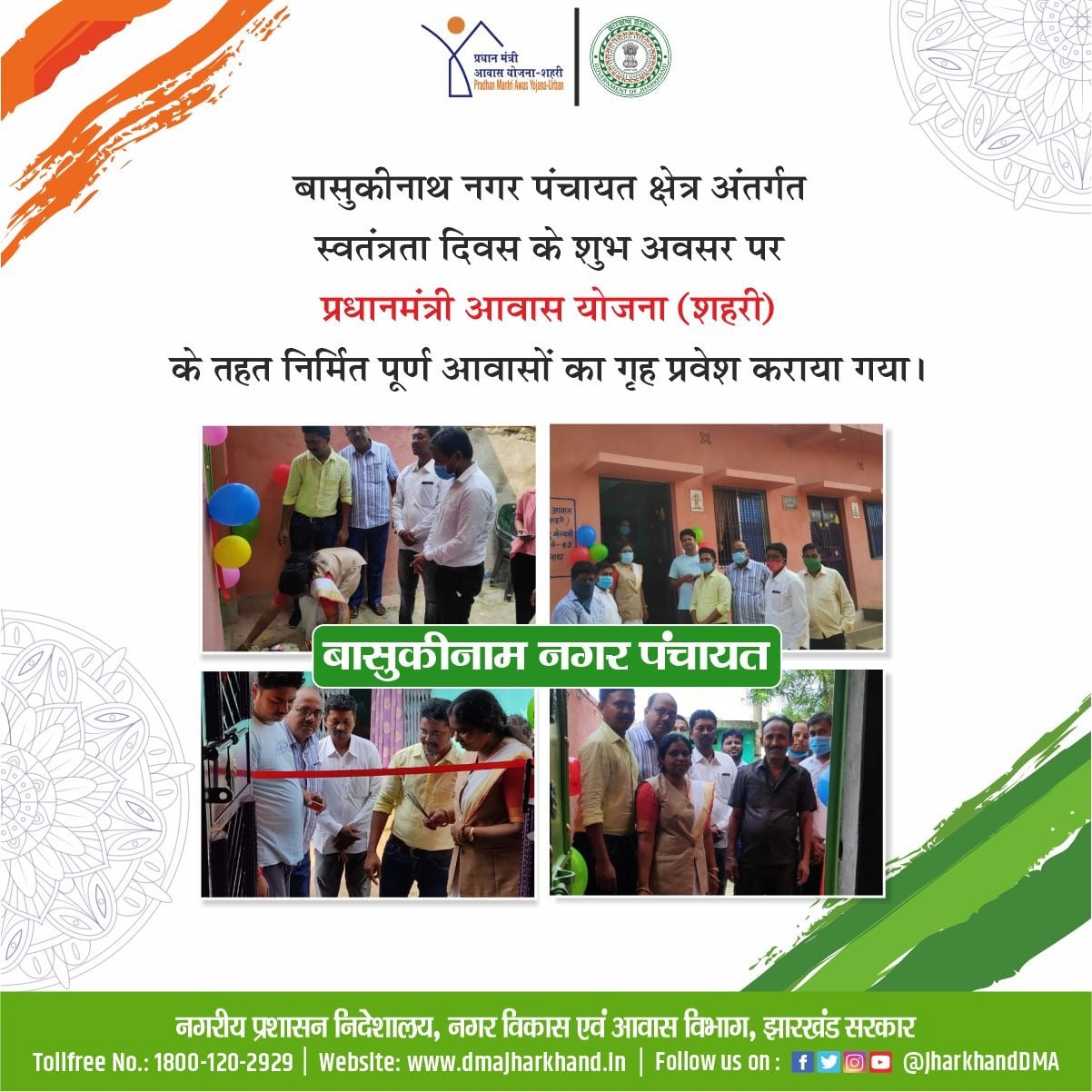 Social media promotional poster of PMAY(U) House inauguration on occasion of Independence Day for Basukinath Nagar Panchayat.