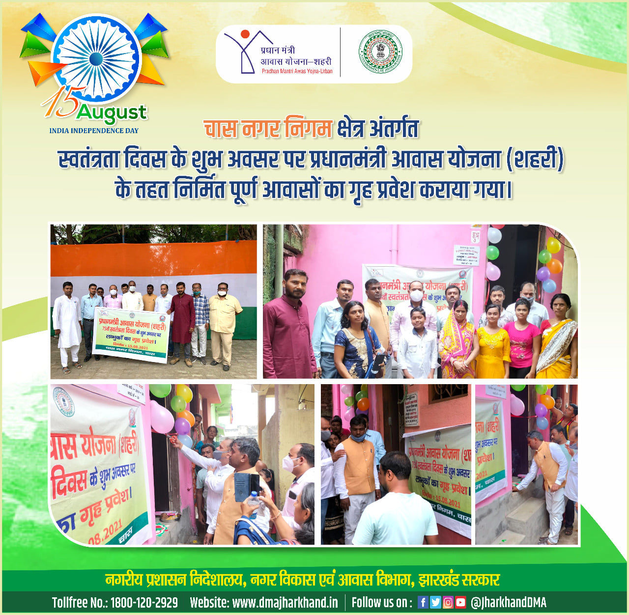 Social media promotional poster of PMAY(U) House inauguration on occasion of Independence Day for Chas Nagar Nigam.