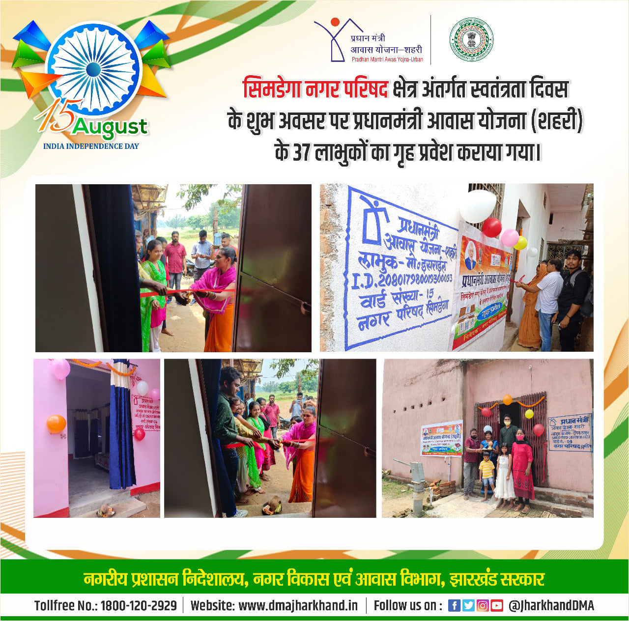 Social media promotional poster of PMAY(U) House inauguration on occasion of Independence Day for Simdega Nagar Parishad.