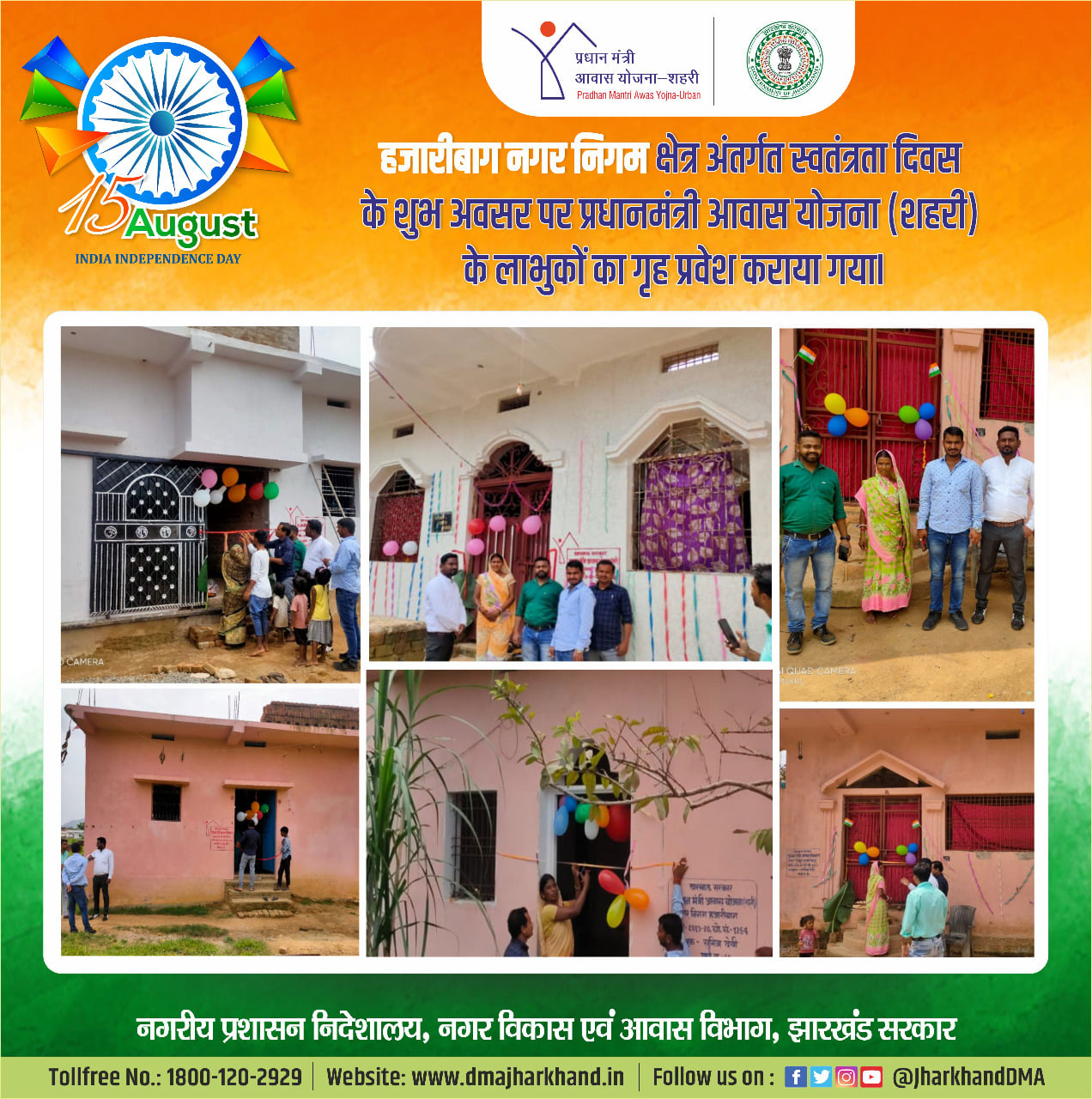 Social media promotional poster of PMAY(U) House inauguration on occasion of Independence Day for Hazaribagh Nagar Nigam.