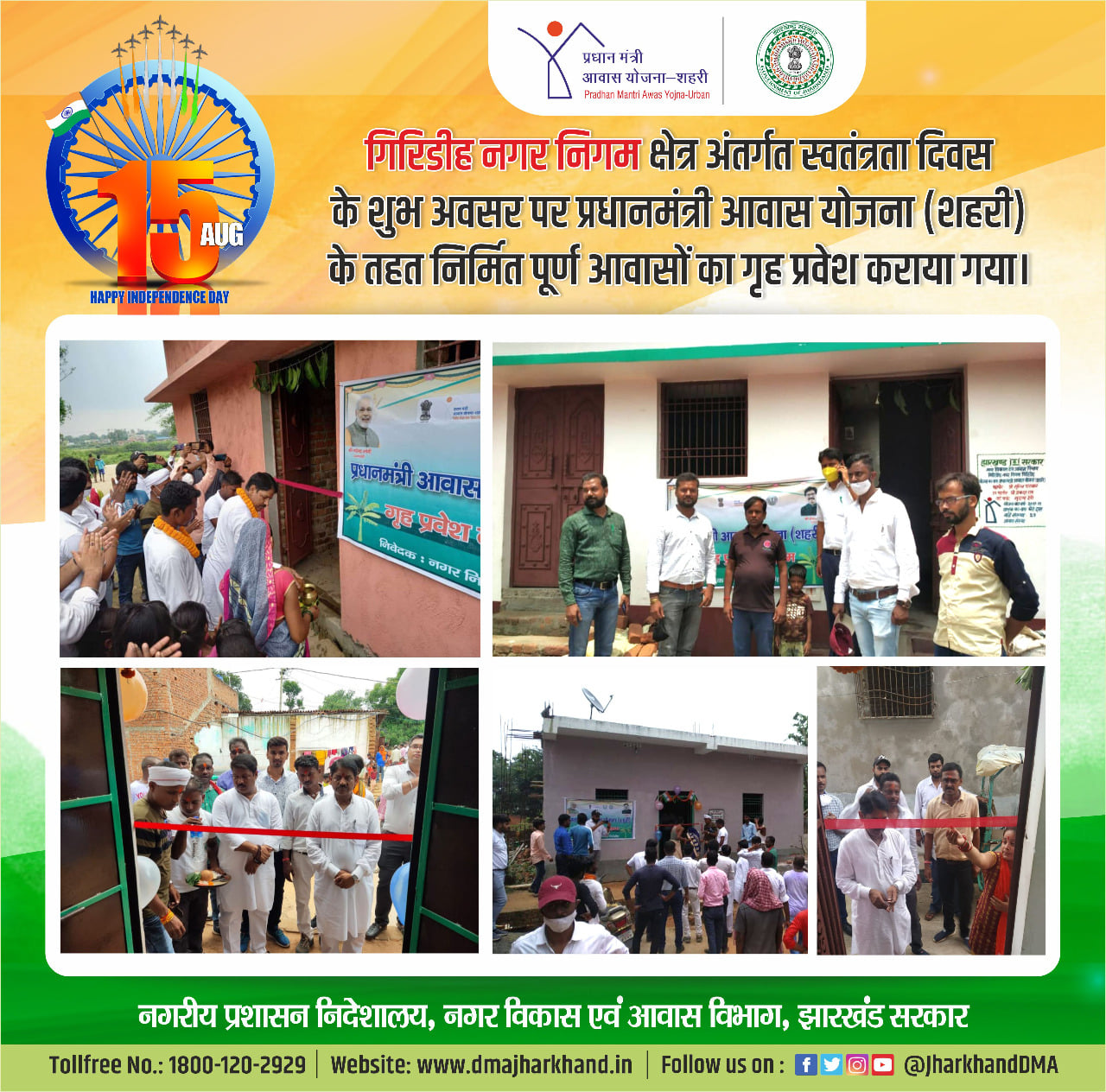 Social media promotional poster of PMAY(U) House inauguration on occasion of Independence Day for Giridih Nagar Nigam.
