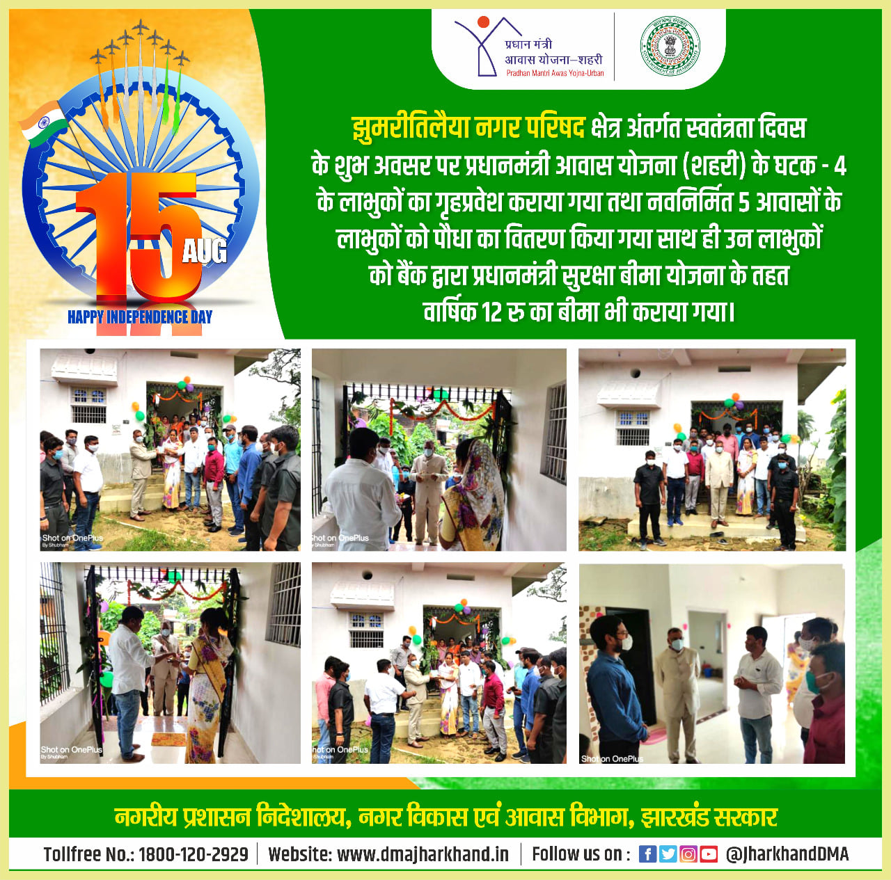 Social media promotional poster of PMAY(U) House inauguration on occasion of Independence Day for Jhumri Telaiya Nagar Parishad.