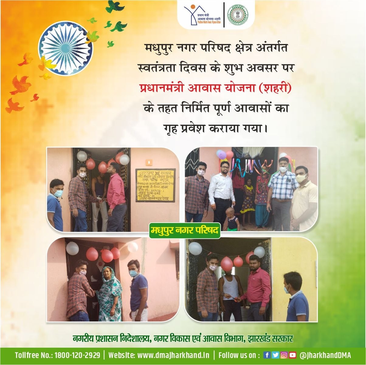 Social media promotional poster of PMAY(U) House inauguration on occasion of Independence Day for Madhupur Nagar Parishad.