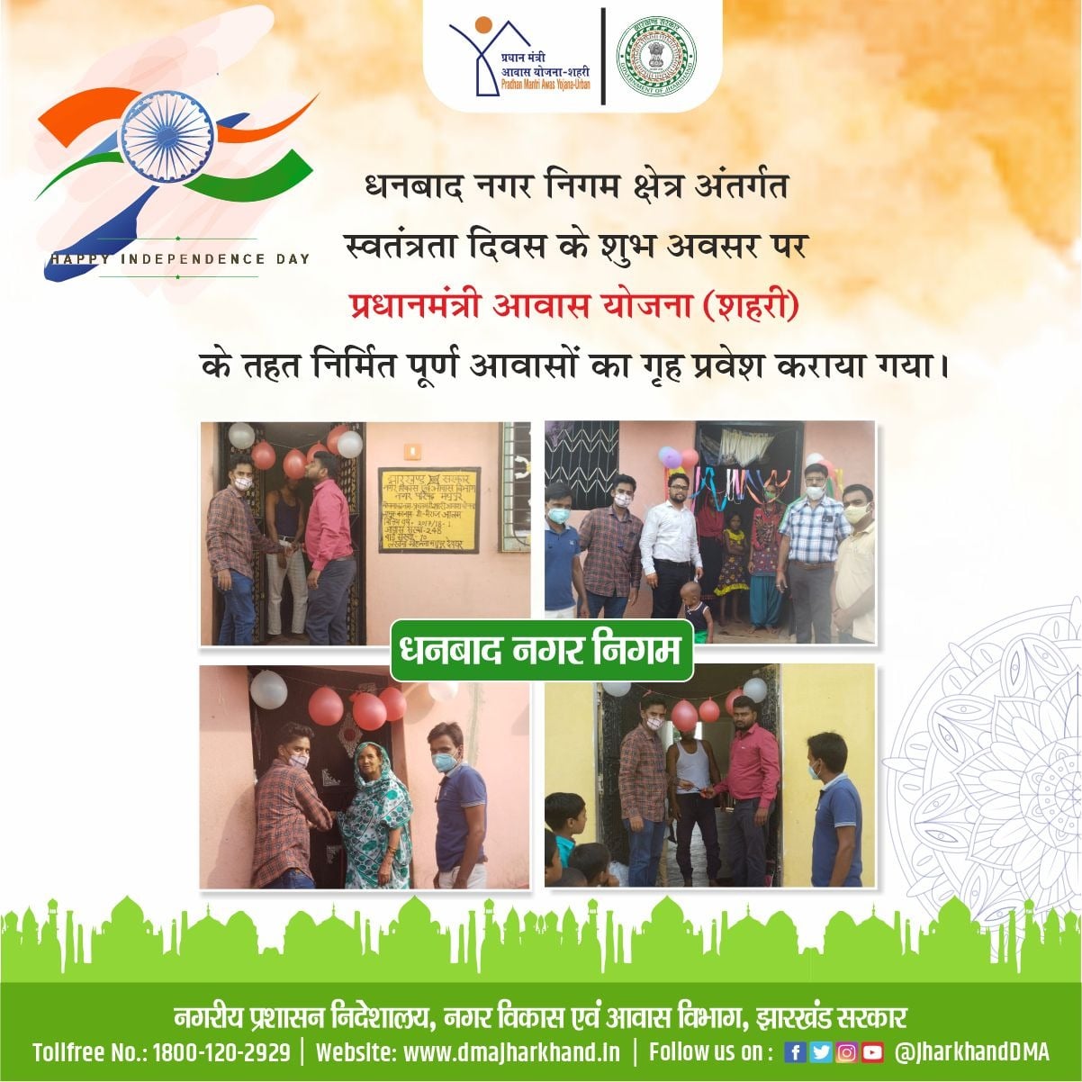 Social media promotional poster of PMAY(U) House inauguration on occasion of Independence Day for Dhanbad Nagar Nigam.