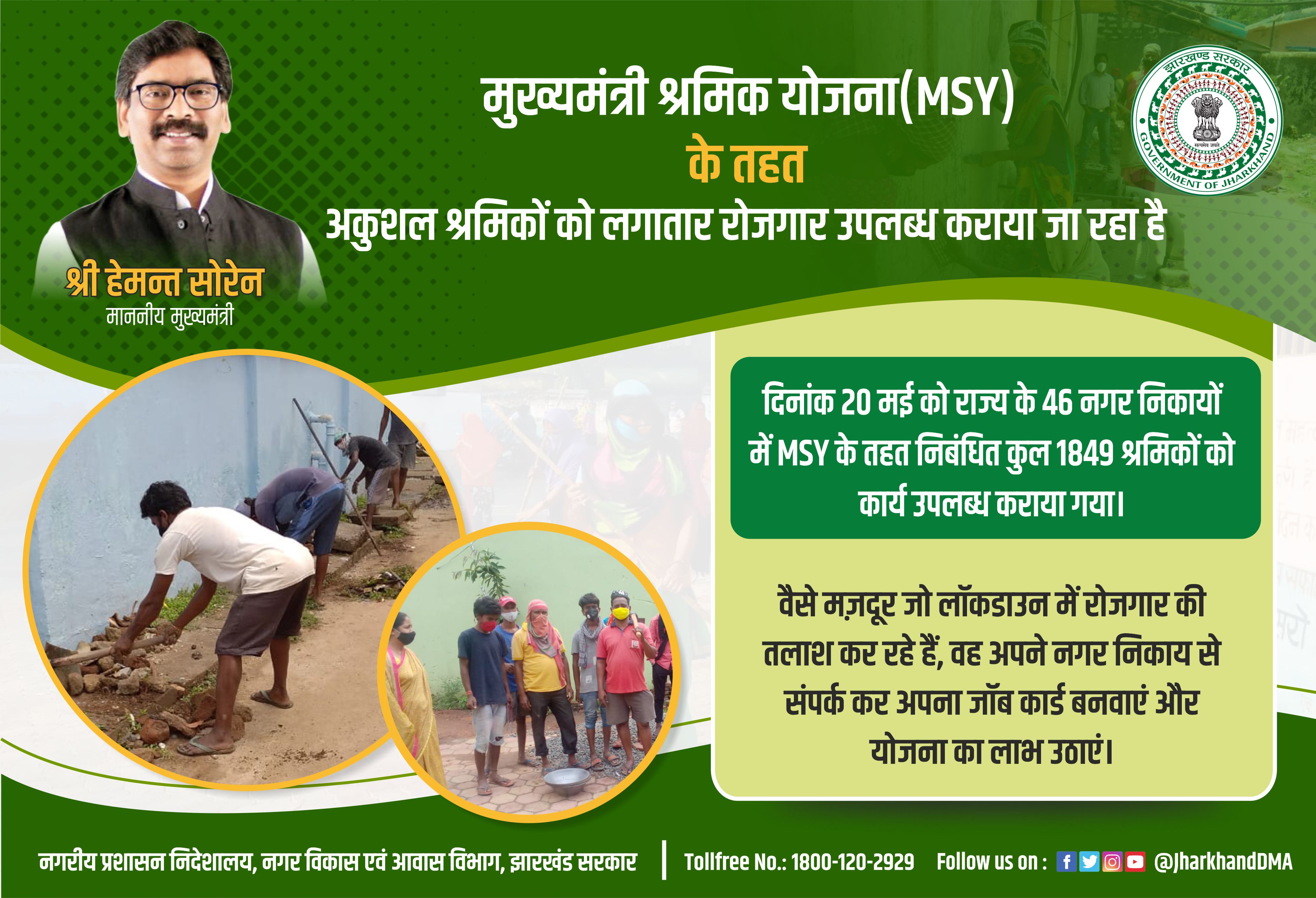 1849 laborers were provided employment in 46 municipal bodies of the state on 20 May 2021 under the Mukhyamantri Shramik Yojana.