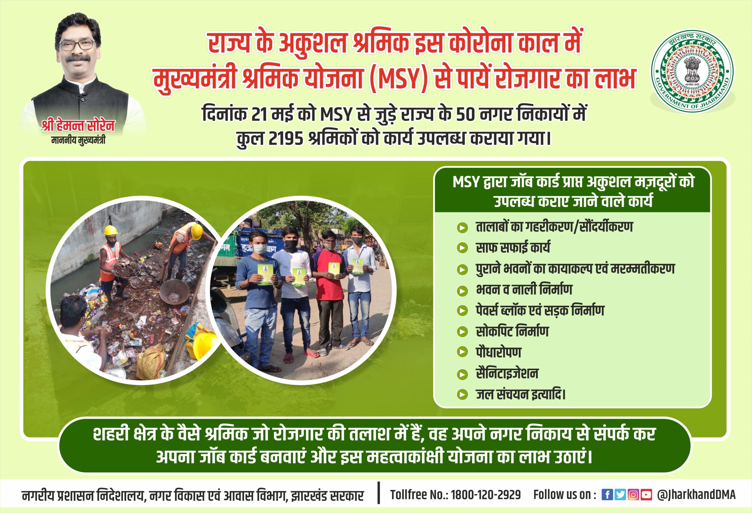 2195 laborers were provided employment in 50 municipal bodies of the state on 21 May 2021 under the Mukhyamantri Shramik Yojana.