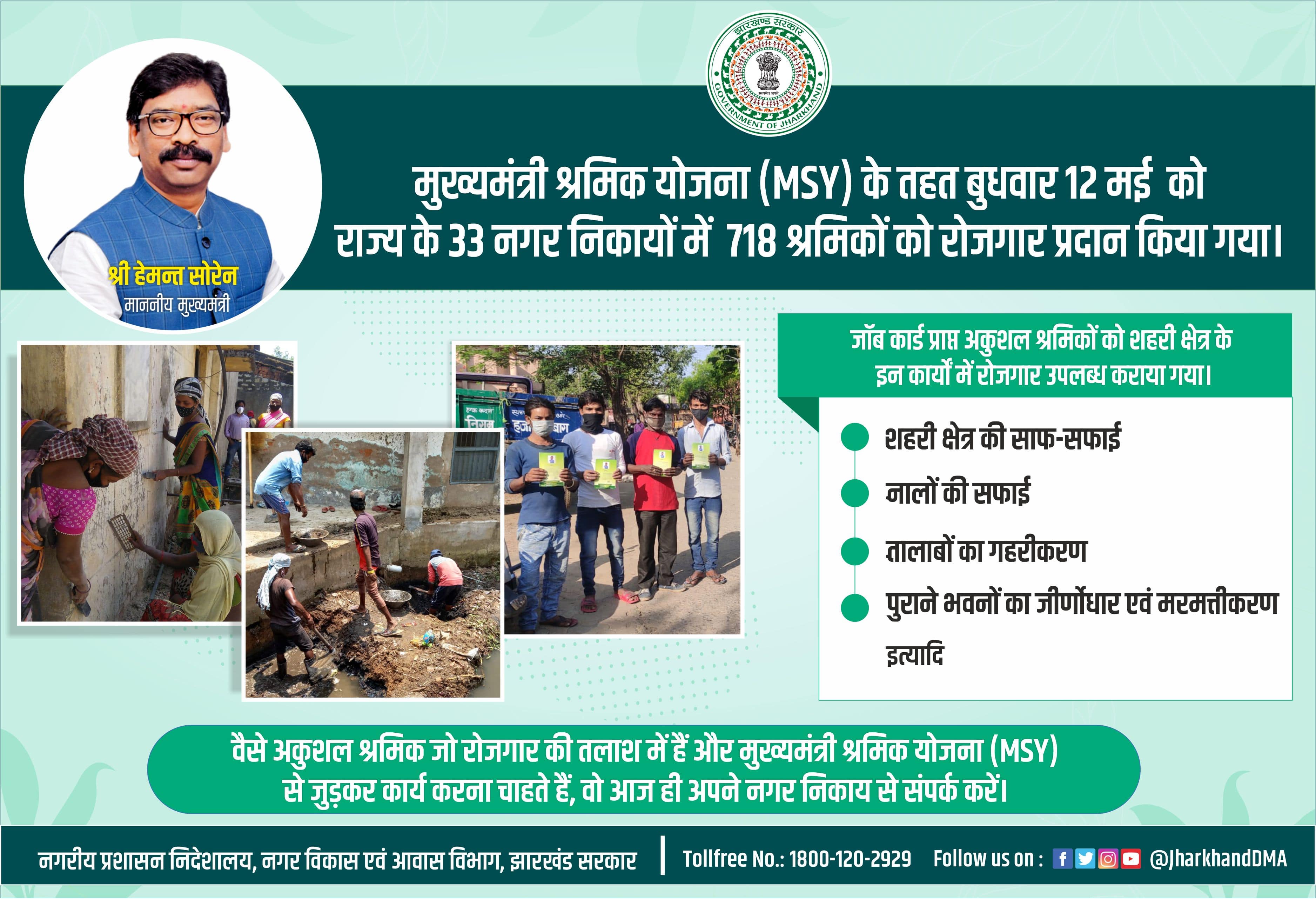 718 laborers were provided employment in 33 municipal bodies of the state on Wednesday 12 May under the Mukhyamantri Shramik Yojana.