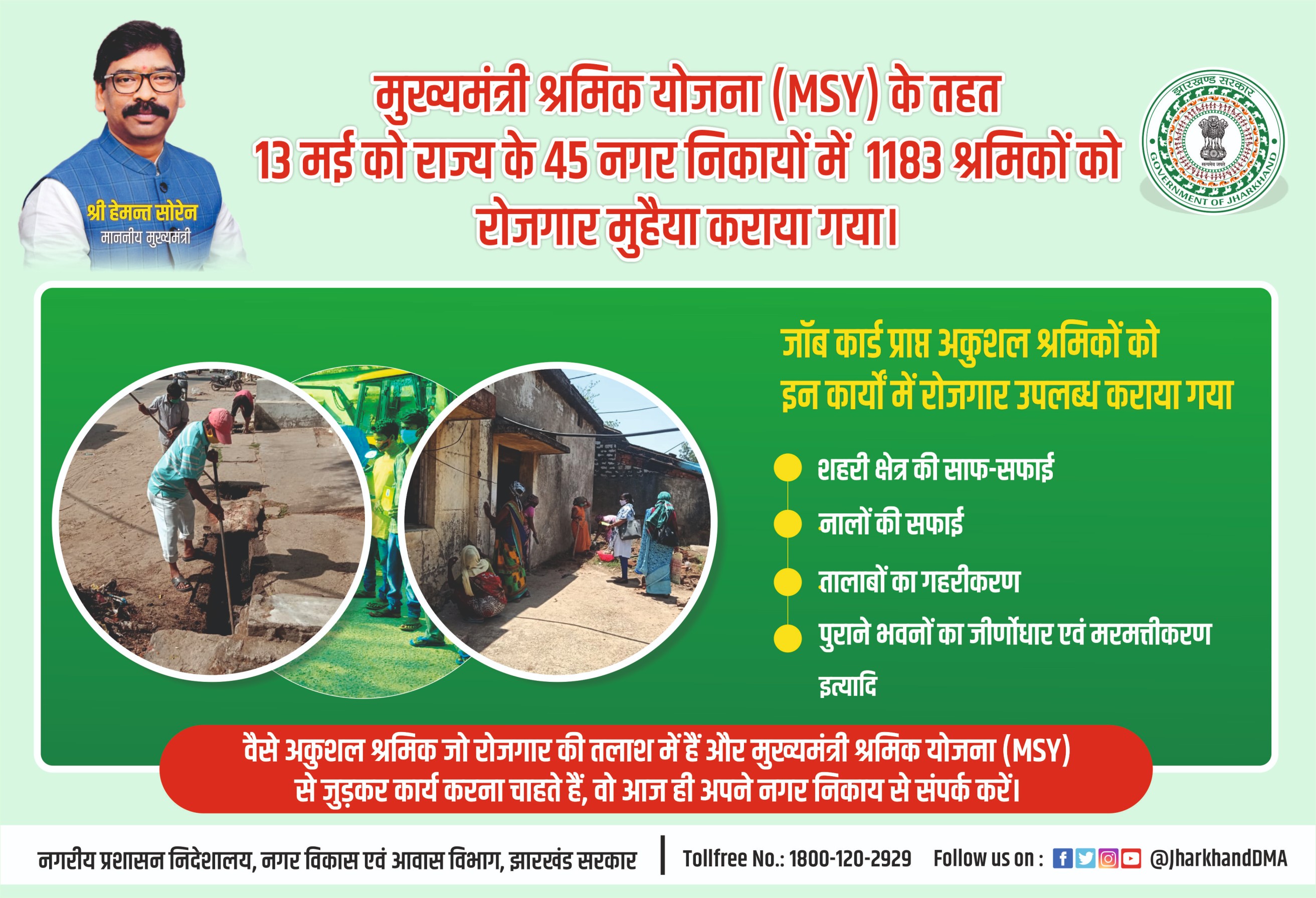 1183 laborers were provided employment in 45 municipal bodies of the state on Wednesday 13 May under the Mukhyamantri Shramik Yojana.