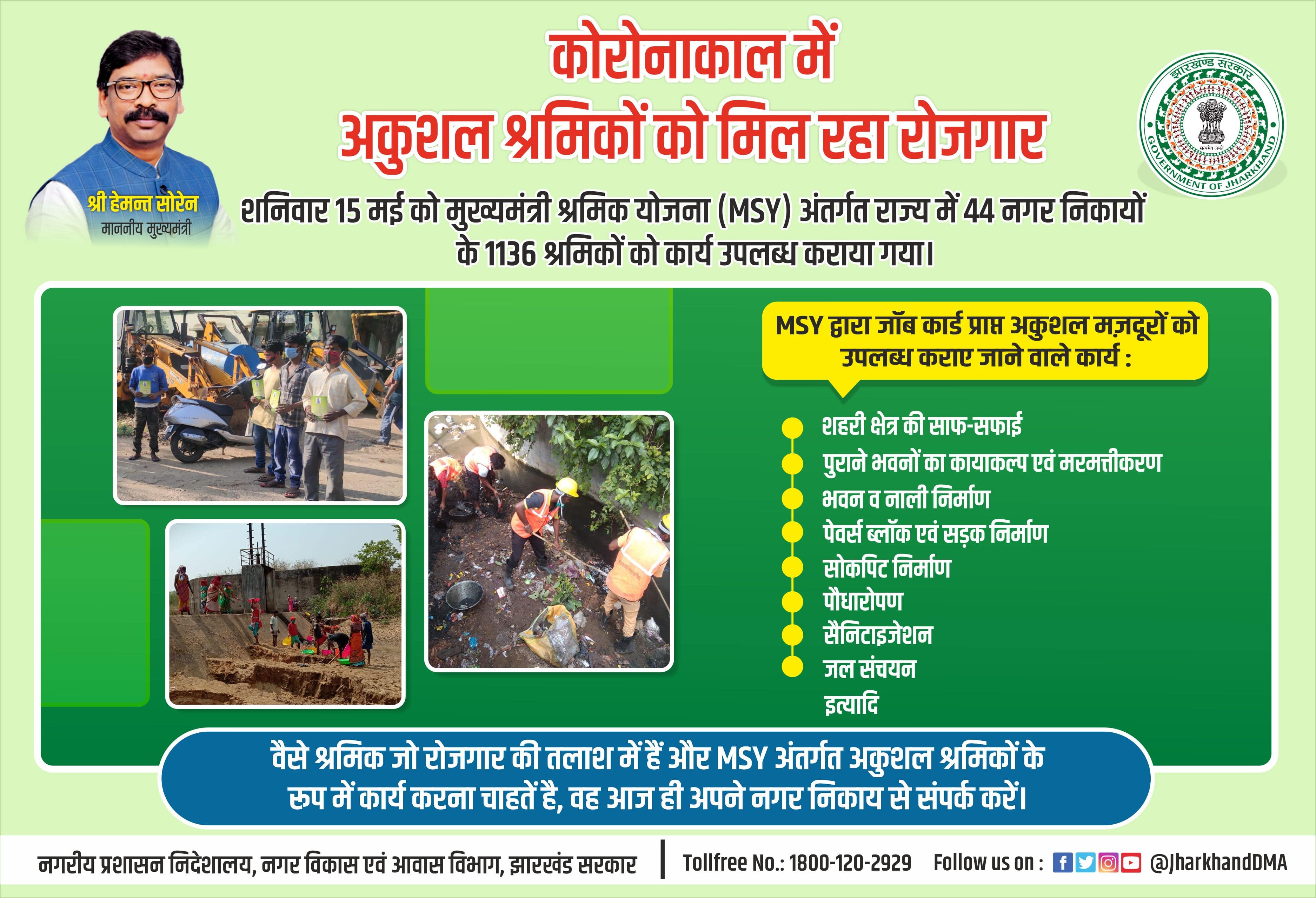 1136 laborers were provided employment in 44 municipal bodies of the state on Saturday15 May under the Mukhyamantri Shramik Yojana.