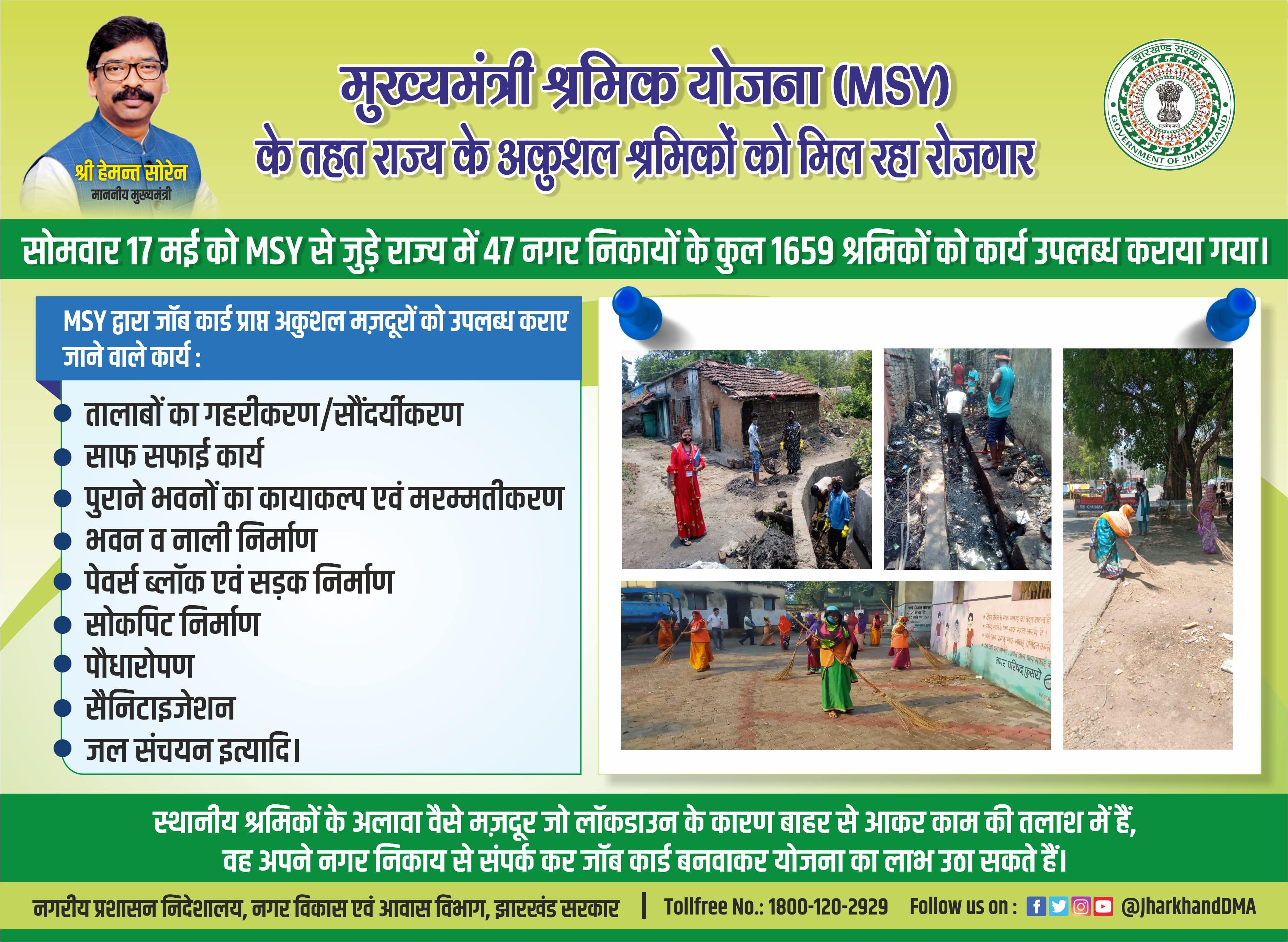 1659 laborers were provided employment in 47 municipal bodies of the state on Friday 14 May under the Mukhyamantri Shramik Yojana.