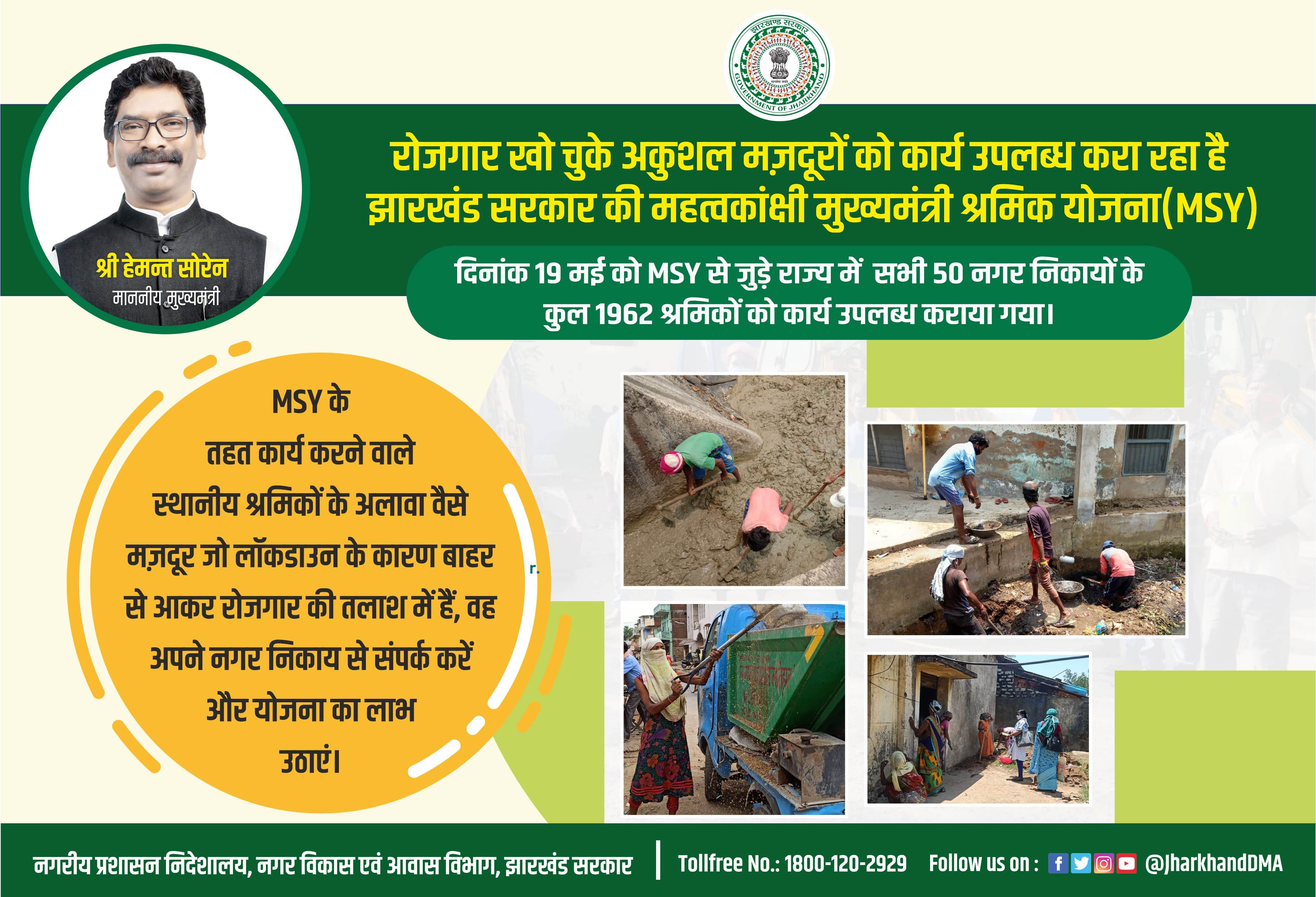 1962 laborers were provided employment in 50 municipal bodies of the state on wednesday 19 May under the Mukhyamantri Shramik Yojana.