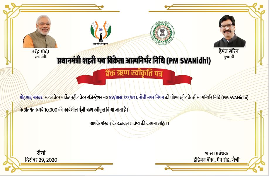 Bank Loan Approval Certificate for PM SVANidhi Scheme