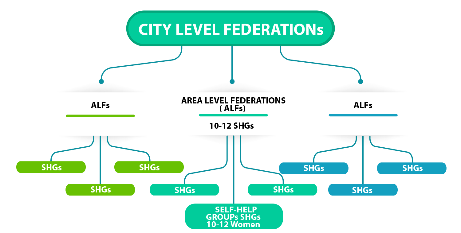 DAY-NULM envisages mobilisation of urban poor households into a three tiered structure with Self-Help Groups (SHGs) at the grass-root level, Area Level Federations (ALFs) at the slum / ward level and City-level Federations (CLFs) at the city-level