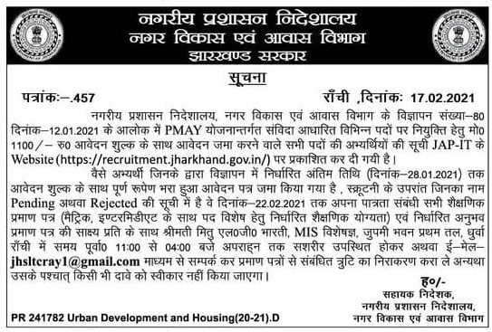 Eligible and Suitable candidates are invited for WALK-IN-INTERVIEW on contractual basis in the City Mission Management Unit (CMMU), constituted under the Directorate of Municipal Administration, Urban Development & Housing Department, Govt. of Jharkhand. |